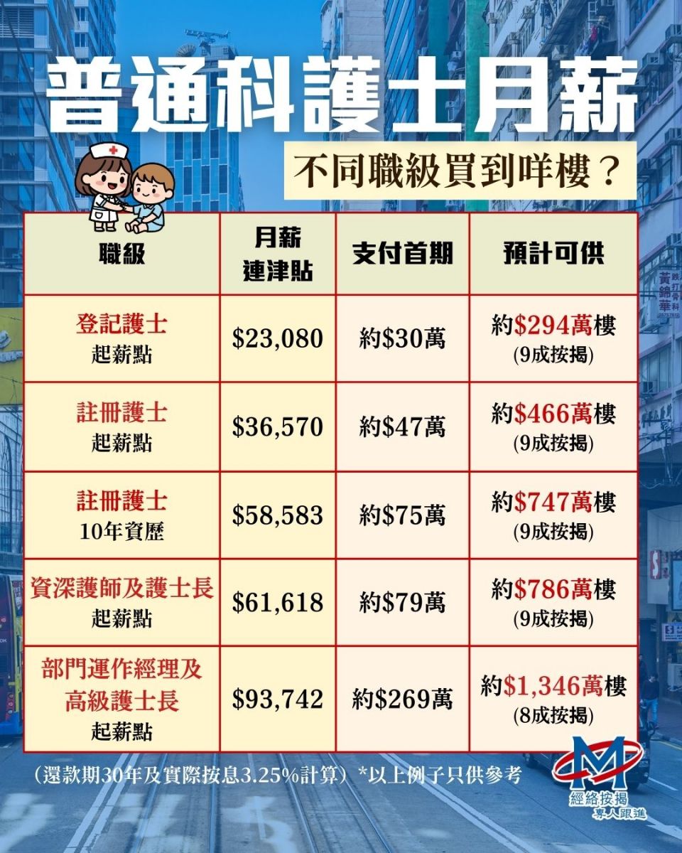 以新入職的登記護士為例,根據現時3.25%按揭利率及30年還款期,借足9成按揭的情況下,大約可購買294萬的物業。而部門運作經理 / 顧問護師,更可以用8成按揭買入1,346萬的單位。