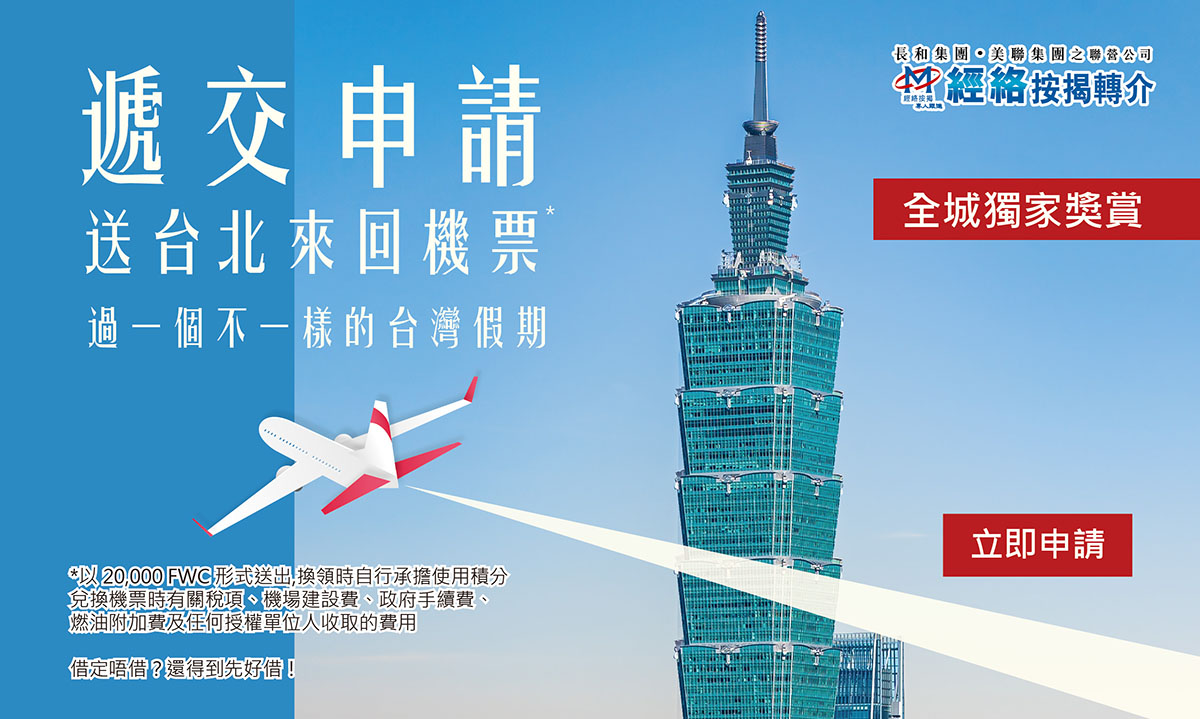 客户只需要透过经络递交指定产品申请后可获得推广码,凭推广码申请指定信用卡并进行一次零售签账,除可获得信用卡基本迎新奖赏外,还可以独家获得经络之额外20,000 FWC 积分,可以换取相等于台北经济舱来回机票一张,同时享2次香港航空贵宾室服务。即使按揭申请最终不获接纳,仍可以获得有关礼遇。