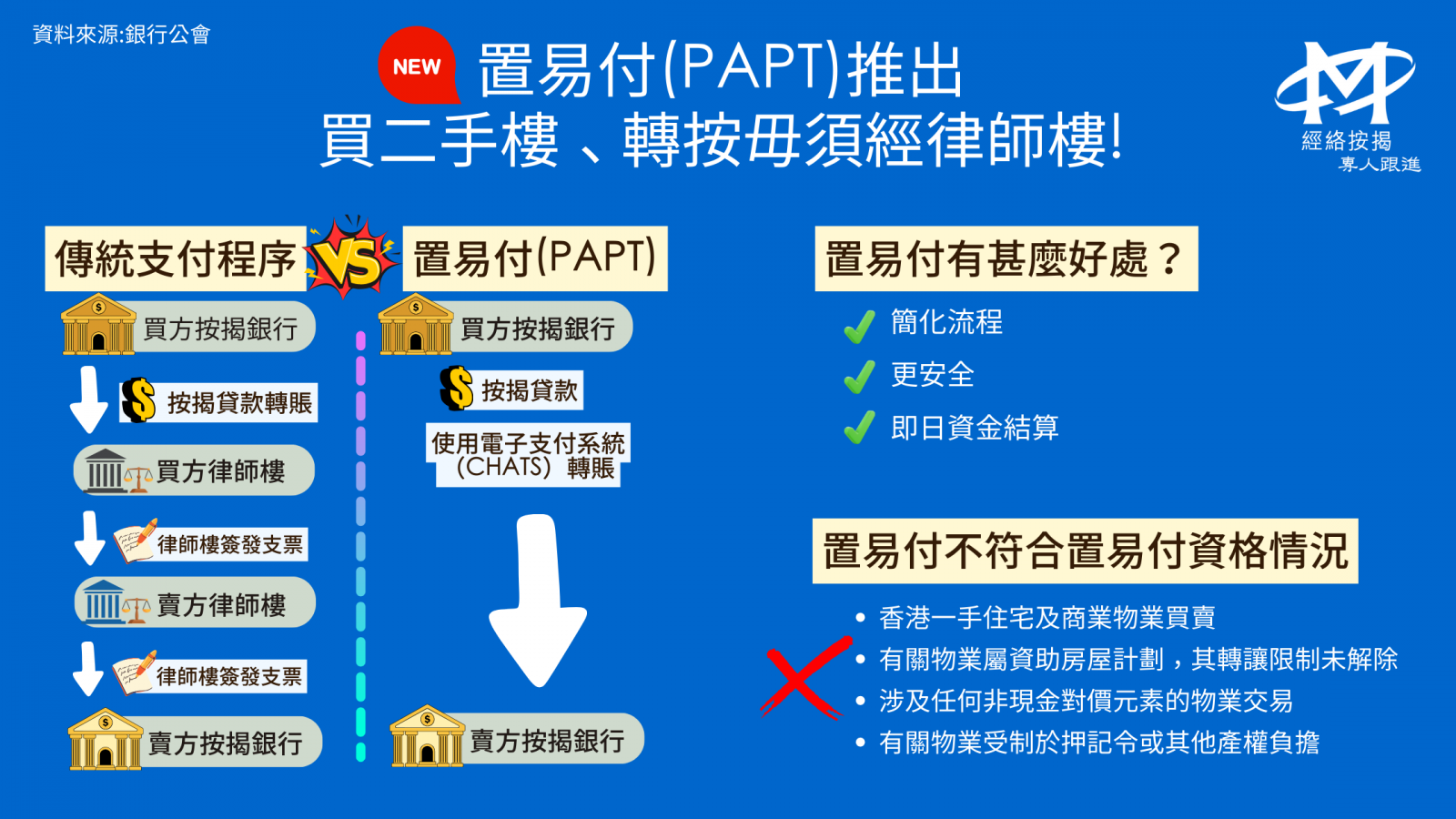过往一般转按过程,按揭款项需经律师楼进行,而早前置易付(PAPT)服务的推出,让转按人士可以在银行之间为按揭贷款资金提供适时和直接的电子转帐,避免出现与支付相关的风险。此项服务更于2026年2月28日伸延至二手楼买卖,详细情况是怎样?本文为大家一一拆解。